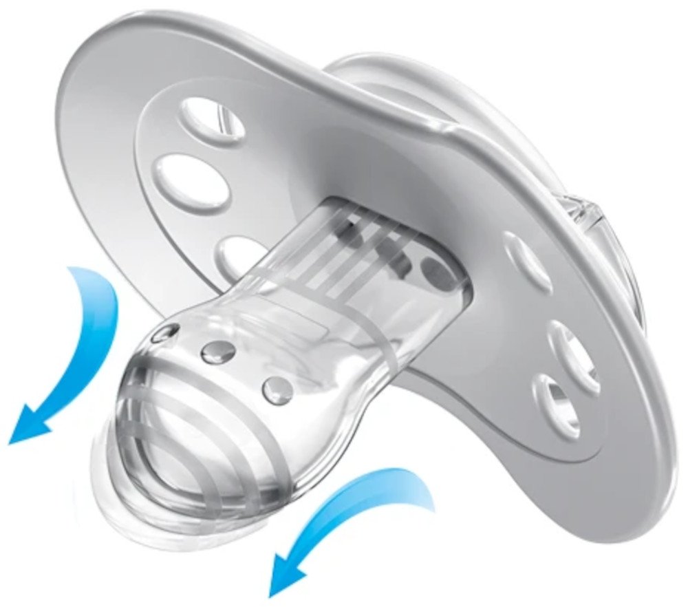 Ορθοδοντικές πιπίλες σιλικόνης 6-18m, 2 τμχ. Δυναμική θηλή. Κατασκευασμένες από ετερογενές στρώμα σιλικόνης, τεντώνονται και συστέλλονται σύμφωνα με τον ρυθμό πιπιλίσματος του μωρού? το συμμετρικό τους σχήμα είναι εμπνευσμένο από το σχήμα της θηλής. Πιπίλες κορυφαίας ποιότητας. Ειδικά διαμορφωμένη ασπίδα. Οπές στην ασπίδα. Πρακτικός κρίκος. Υγιεινό κάλυμμα. Περιλαμβάνεται θήκη για την υγιεινή αποθήκευση θηλών. Εξασφαλίζει άνετη αναπνοή και κατάποση σάλιου. Δεν πλένεται στο πλυντήριο πιάτων. Δεν προορίζεται για χρήση σε φούρνο μικροκυμάτων. Μπορείτε να ρίξετε βραστό νερό. Για χρήση σε αποστειρωτή