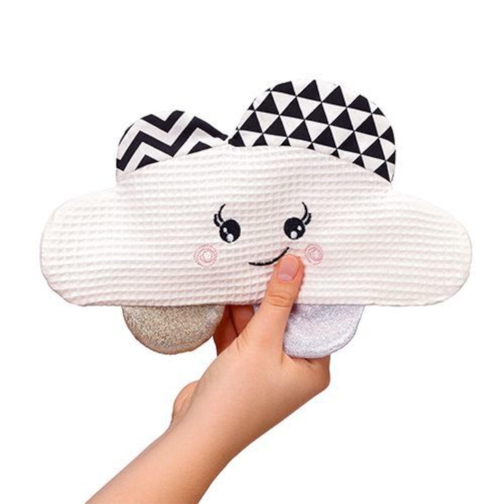 Ένα επίπεδο παιχνίδι αγκαλιάς σε σχήμα σύννεφου διεγείρει την ανάπτυξη των αισθήσεων του παιδιού μέσω του παιχνιδιού. Οι διάφορες υφές διεγείρουν την αίσθηση της αφής. Τα χρώματα και τα σχέδια με αντίθεση διεγείρουν την όραση, ενώ τα μεγάλα μάτια και το ωραίο χαμόγελο ενθαρρύνουν το παιδί να ασχοληθεί. Είναι κατασκευασμένο από μαλακό βαμβάκι με γέμιση. Για ηλικίες από 0 μηνών. Διαστάσεις: 26x9cm