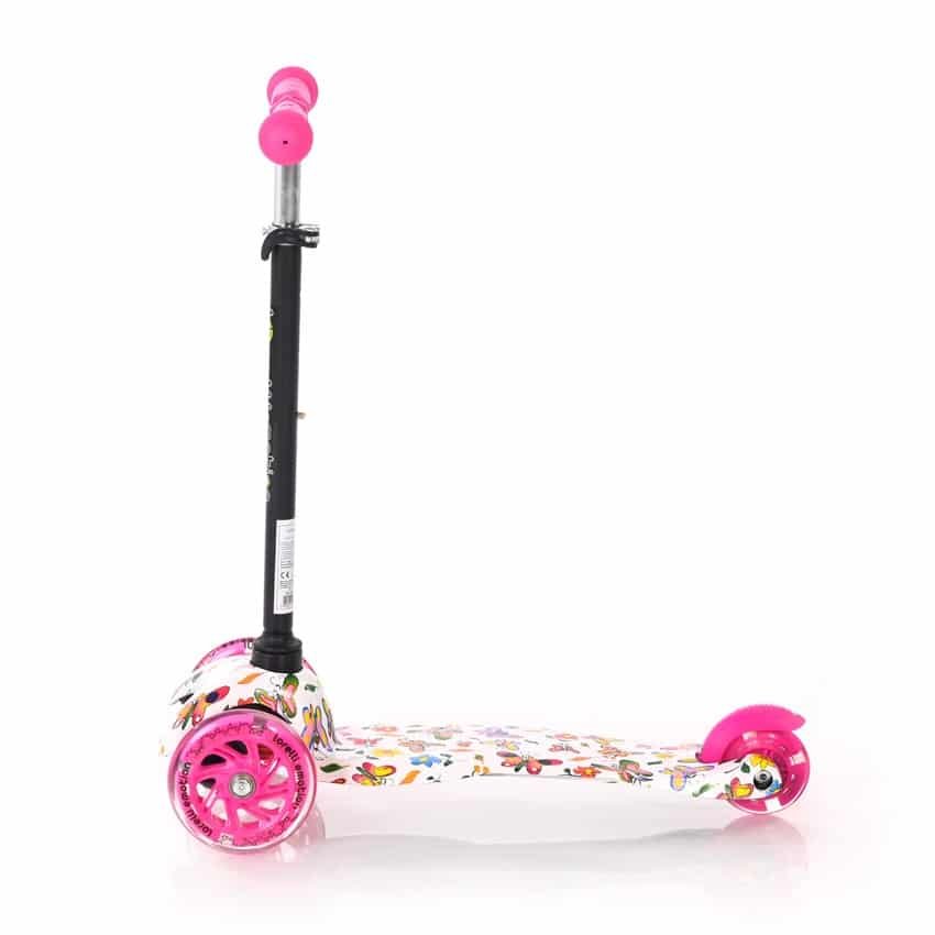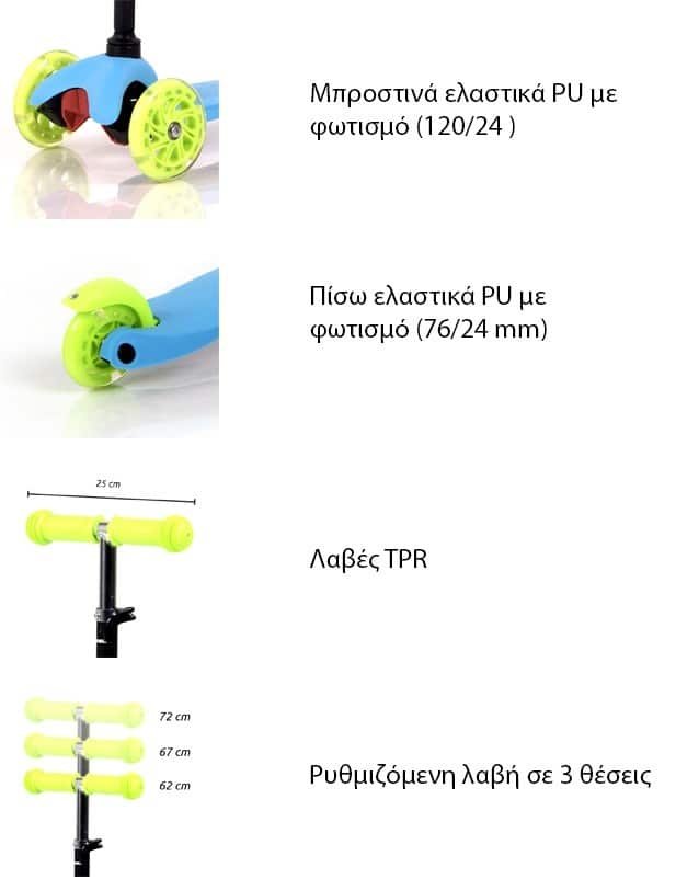 Πατίνι τρίτροχο για 3+ ετών έως 20kg Mini. Μπροστινά λάστιχα PU με φωτισμό 120/24mm. Ποδόφρενο. Ρουλεμάν υψηλής ποιότητας ABEC-7Λαβές TPRΠίσω ελαστικά PU με φωτισμό 76/24mm. Σανίδα πολυπροπυλενίου μέγεθος: 400/110mm. Ρυθμιζόμενη λαβή σε 3 θέσεις. BS EN 71Διαστάσεις: 53x25x71cm. Βάρος: 2,15kg