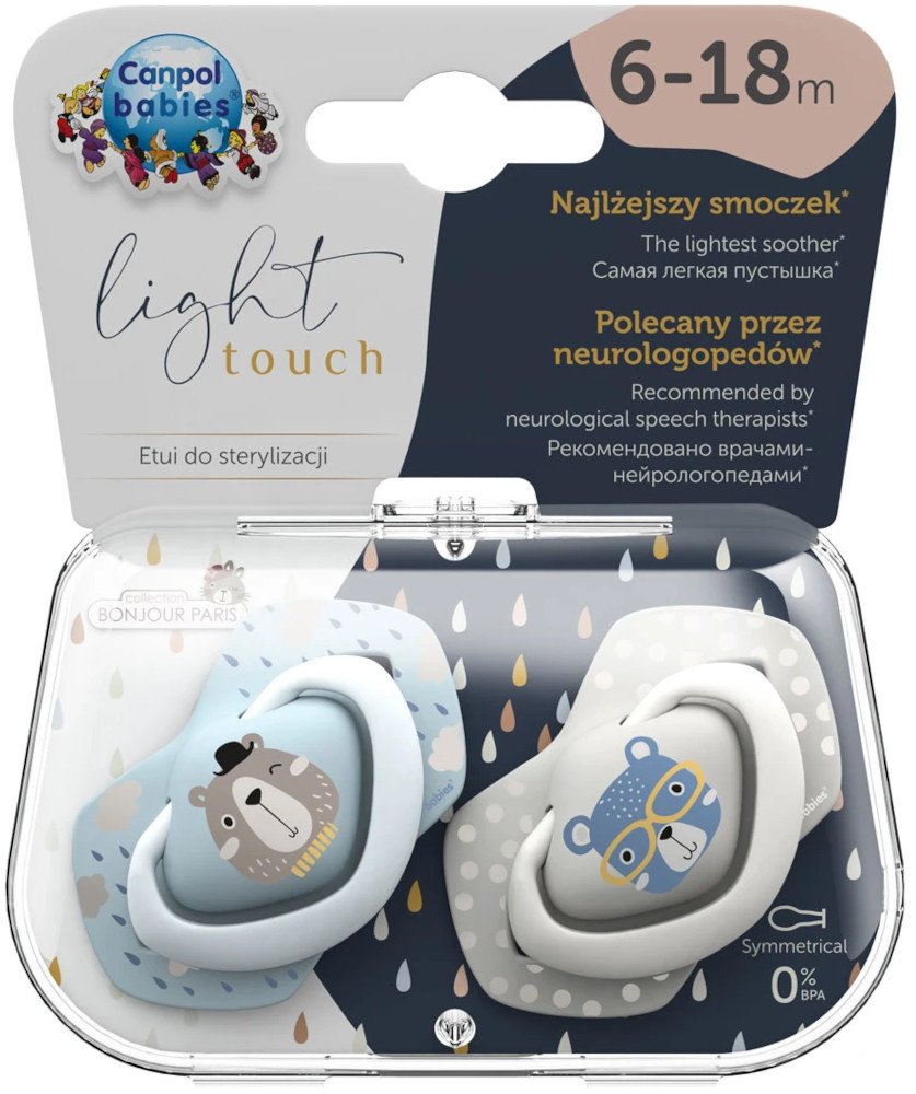 Οι πιπίλες Light touch έχουν σχεδιαστεί για να παρέχουν μέγιστη άνεση στα μικρότερα μωρά. Η εξαιρετικά μαλακή σιλικόνη απαιτεί λιγότερη προσπάθεια κατά το πιπίλισμα, ενώ η διαμορφωμένη ασπίδα δεν επιβαρύνει τη σύγκλειση των δοντιών και εξασφαλίζει ελεύθερη αναπνοή, γεγονός ιδιαίτερα σημαντικό σύμφωνα με τους ειδικούς για τη σωστή ανάπτυξη της στοματικής κοιλότητας του παιδιού. Ο βολικός κρίκος της πιπίλας επιτρέπει τη στερέωση αλυσίδας και την ευκολότερη πρόσβαση στο παιδί. Οι πιπίλες Light touch διατηρούνται εύκολα καθαρές χάρη στη μοντέρνα τους θήκη που μπορεί να χρησιμοποιηθεί για την αποθήκευση, αλλά και για τη γρήγορη και άνετη αποστείρωση σε φούρνο μικροκυμάτων. Αρκεί λίγο νερό και 2 λεπτά για να διατηρήσετε της πιπίλες καθαρές. Εξαιρετικά ελαφριές. Μαλακό λάστιχο σιλικόνης. Η εξαιρετικά μαλακή σιλικόνη απαιτεί λιγότερη προσπάθεια κατά το πιπίλισμα με αποτέλεσμα να προσφέρει άμεση ανακούφιση. Εξασφαλίζει άνετη αναπνοή. Ειδικά διαμορφωμένο σχήμα κάτω από τη μύτη για εύκολη αναπνοή. Για ηλικίες 6-18 μηνών